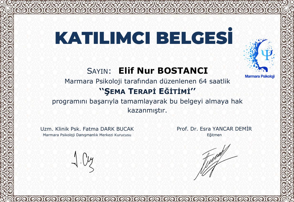 Klinik psikolog Elif Nur Bostancı, psikoloji lisans eğitimini İstanbul Medeniyet Üniversitesi’nde 3.95/4.00 not ortalamasıyla birincilikle tamamlamıştır. Ardından Beykoz Üniversitesi klinik psikoloji yüksek lisans programına birincilikle tam burslu kabul almıştır ve yüksek onur derecesiyle mezun olmuştur. Eğitim hayatı boyunca İstanbul Sultan Abdülhamid Han Eğitim ve Araştırma Hastanesi, Marmara Üniversitesi Eğitim Araştırma Hastanesi gibi ruh sağlığı hastaneleri ve çeşitli anaokulu, özel eğitim merkezi ve özel kliniklerde stajlarını tamamlamıştır.